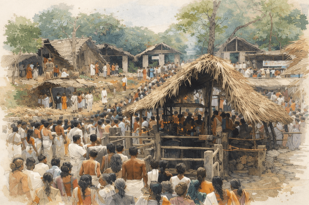 On the western bank of the river stands the permanent shrine, Ikkare Kottiyoor with its sanctity and age-old traditions but across the waters on the eastern bank is something far more unusual, the Akkare Kottiyoor yagna site. Here, no walls rise and no sanctum stands, for it is forbidden to build anything permanent. This sacred ground is meant to remain simple, echoing the life of hermits who once bore witness to a tragedy etched forever in Hindu mythology: the self-immolation of Goddess Sati.