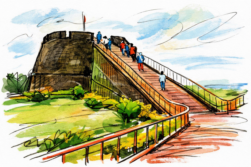 The fort walls are pierced with hundreds of gun holes, each positioned with precision, upper holes for long-range attacks, middle ones for marching enemies and lower ones for close combat. Unlike most forts, Bekal has no palaces or royal residences or a place of luxury, but of vigilance with a sentinel standing guard against invasions from land and sea. At the entrance stands a serene Hanuman Temple, believed to be as old as the fort itself watching over this mighty structure. Nearby, the mosque built by Tipu Sultan speaks of another era when the fort changed hands between the Ikkeri rulers, Hyder Ali, Tipu Sultan and the British. Each left their mark, but none could erase Bekal’s indomitable spirit.