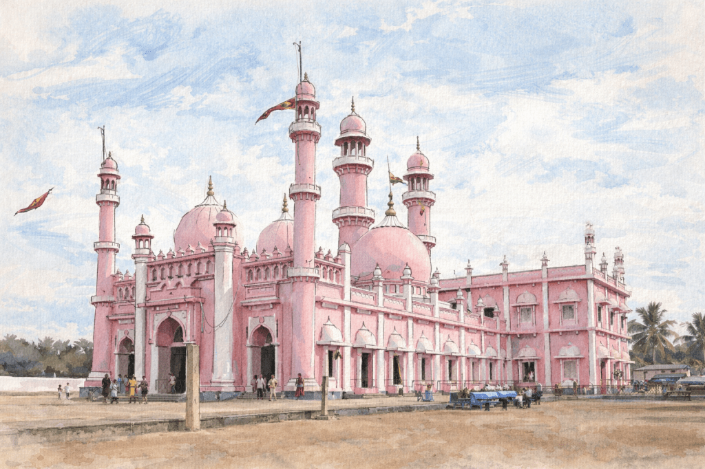 As you travel along the breezy coastline of Trivandrum, where the Arabian Sea kisses the vibrant sands of Shangumugham, you will find a serene landmark that has shaped the identity of the fishing villages around it for centuries, the beautiful Beemapalli Mosque. Standing gracefully between the beach and the backwaters of Valiathura, this pink-hued shrine is not just a place of worship, but a living chronicle of compassion, migration, tradition, and faith.