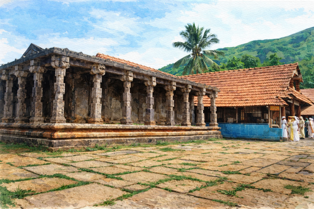 Architecturally, Thirunelli follows the austere elegance of traditional Kerala temple design. The sanctum is enclosed by tiled-roof verandahs and open courtyards, while cube-shaped granite pillars with subtle carvings line the outer walls. Some structures appear intentionally incomplete such as the granite lamp post lacking a dwaja stambha while the cloistered walkway around the temple remains unfinished. Local tradition attributes this to a historic dispute between the Vellattiri king and the Coorg Raja, halting construction midway. Epigraphical evidence and literary references credit the temple’s construction to Chera King Kulasekhara, who ruled between the 8th and 9th centuries. His Sanskrit work Mukundamala, written after renouncing his throne, contains verses expressing deep devotion to Vishnu at Thirunelli.