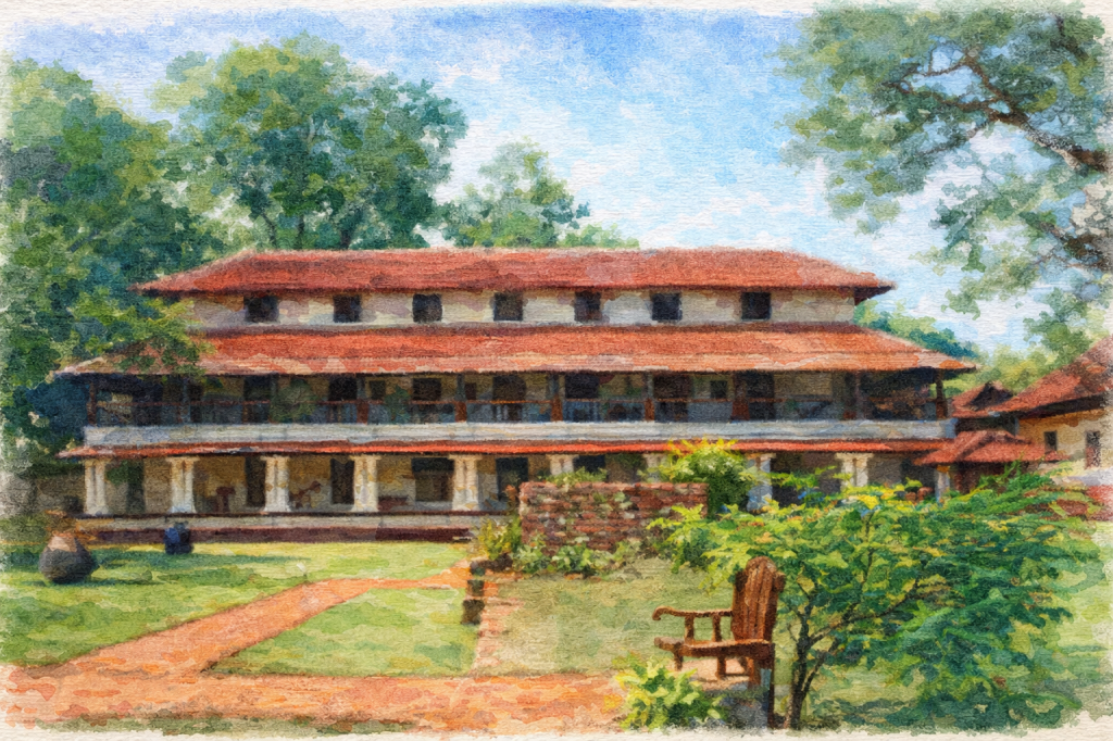 Architecturally, Poomully Mana is a classic example of traditional Kerala design. The structure features expansive terracotta-tiled roofs, multiple tiers, long linear verandahs, and double-pillared halls that allow air and light to flow freely. Within the compound stand a padippura (gateway), a kalari (martial arts training space), and a koothambalam (theatre hall). The spacious courtyards are filled with medicinal plants and trees, reflecting the Mana’s inseparable bond with nature and healing. What makes Poomully Mana truly special is that its upkeep and spirit are sustained not in isolation, but with the involvement of the local community preserving it as a shared cultural space rather than a private relic.