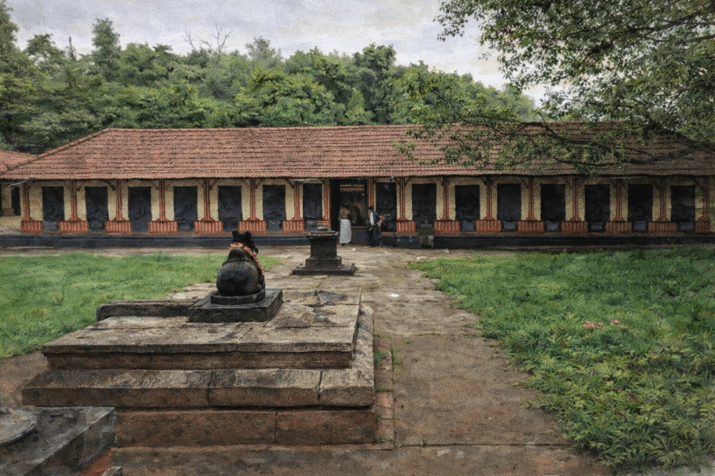 The journey between Thrissilery and Thirunelli once wound through dense forests, paths walked by sages and seekers alike. While history offers no clear record of the temple’s construction, it is widely believed to date back to the era of Parasurama, the mythical creator of Kerala. The temple complex is surrounded by sacred groves, housing several unique sub-shrines. Among them is the Jaladurga Temple, standing within a pond that has never dried up. Believed to possess healing properties, this shrine is said to be one of the 108 Durga temples consecrated by Parasurama. Equally remarkable is the Vanasastha Shrine, where Lord Sastha is depicted seated in deep meditation, in lotus posture, under an open sky. The sanctum has no roof, allowing nature itself to become part of the worship. Philosophers and devotees alike have drawn parallels between this form and that of Lord Buddha, making it one of the most intriguing icons in Kerala’s spiritual landscape. Within the main sanctum, Goddess Parvathy is represented only by a peedam (seat), based on the belief that she departed to attend Daksha’s Yagna at Kottiyoor without Shiva’s consent and never returned. The silence of this absence adds a profound emotional depth to the temple’s aura.
