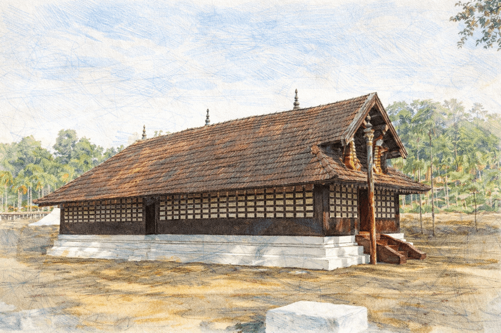 Set within a vast open ground, the Valliyoorkavu temple complex reflects the humility and grounded faith of its origins. Built in a style reminiscent of traditional Kerala homes the temple avoids architectural grandeur in favour of spiritual presence. The complex consists of the Sreekovil, Nadappanthal and Pathayapura along with two sacred groves – the Mele Kavu and the Keezhu Kavu. Even today, the temple’s architecture conveys a sense of quiet dignity, inviting pilgrims to focus inward rather than be distracted by external splendour. The presiding deity of Valliyoorkavu is a swayambhoo (self-manifested) presence, revered in three distinct forms as: Vana Durga as the guardian of forests worshipped by tribal communities who depend on nature for survival, Bhadrakali as the fierce and powerful mother goddess for all, Jala Durga as the protector of waters and livelihoods along the Kabini River deeply venerated by river-dependent tribes.